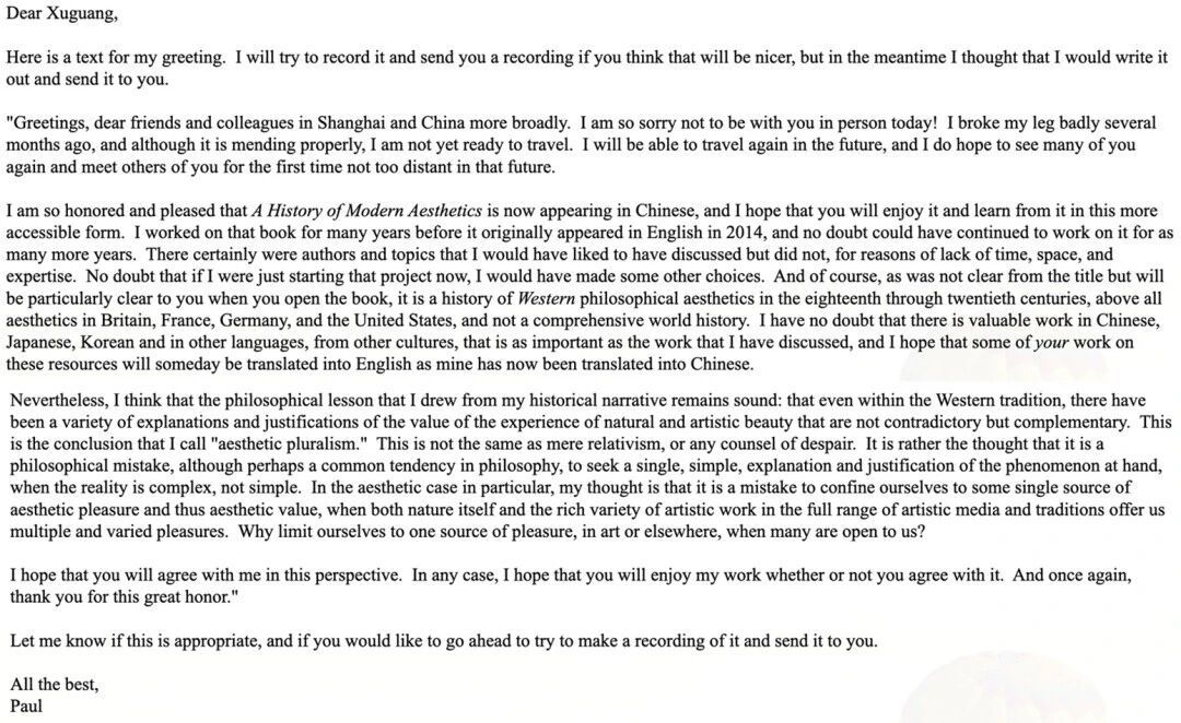 《现代美学史》图书揭幕仪式上,刘旭光教授阅读了Paul Guyer教授的贺信。Guyer教授因身体原因,不能亲赴会议现场表示遗憾,他在贺信中称:“我非常荣幸并由衷欣喜,《现代美学史》如今得以以中文面貌与大家见面”,同时也指出,“这并非一部涵盖全球的世界美学史。我深知,在中文、日文、韩文以及其他语言中,同样有着极为重要的美学研究成果,它们在思想价值上毫不逊色于我书中所论述的内容。我衷心希望,未来能有更多你们的优秀研究成果被译介成英文,正如我的著作如今得以以中文与大家相见一样。”